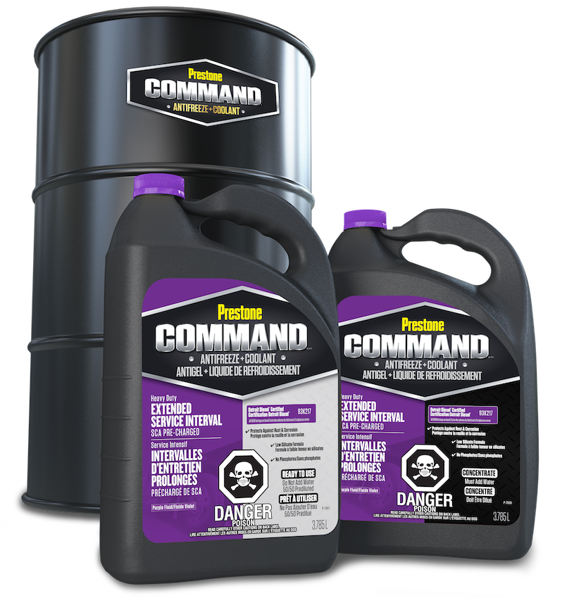 Prestone Command® Extended Service Interval antifreeze+coolant (ready to use) is designed to work with all Class 6-8 vehicles. It is compatible with any IAC engine. This formula is nitrited and precharged with supplemental coolant additive (SCA).